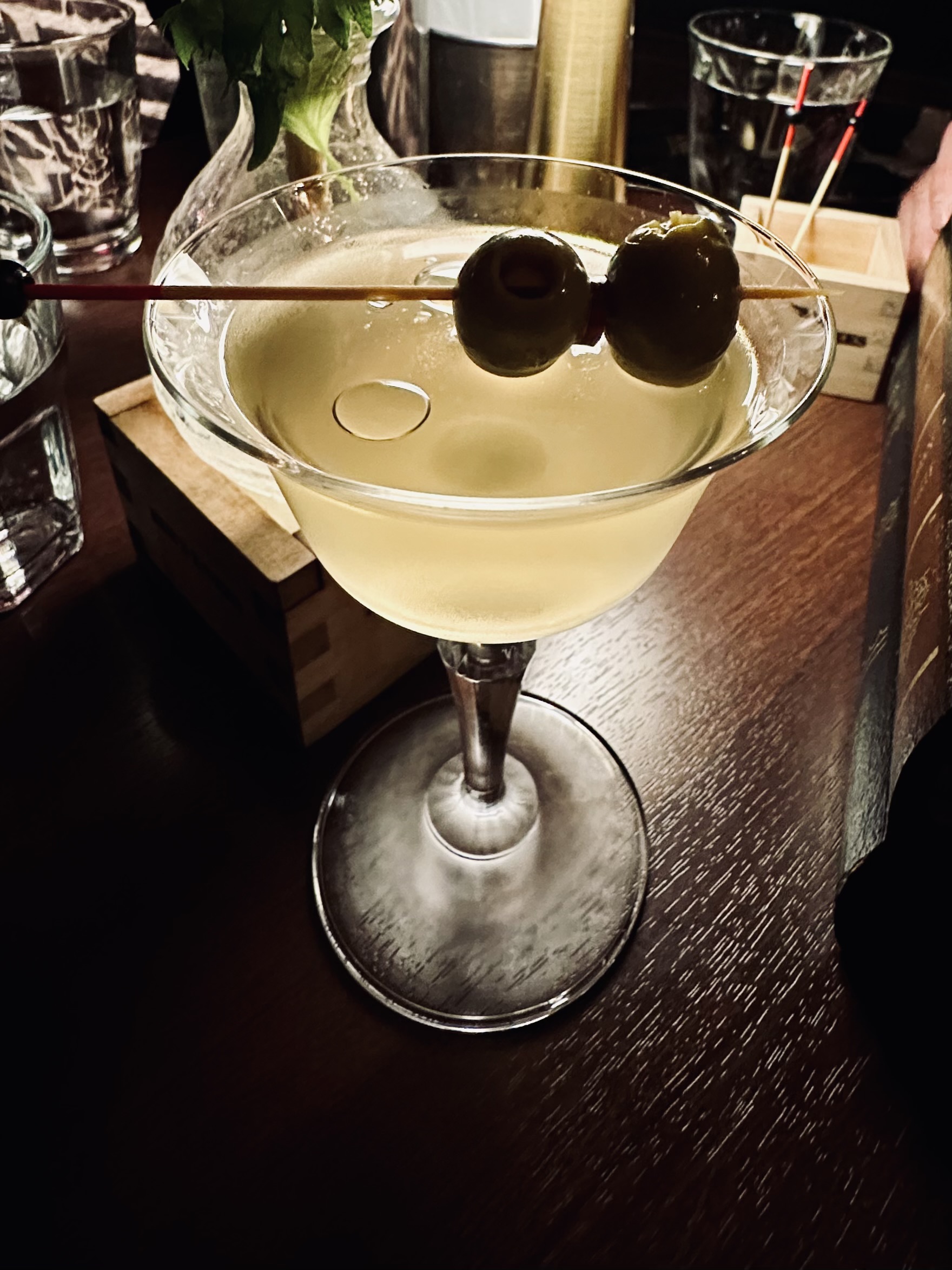 I’ve cheated slightly here as the cocktail pictured in the coupe glass is not in fact the Ki No Tea martini mentioned in the article. That wasn’t even my drink, although I did get to taste it. My drink, the one pictured, was a Dashi Martini garnished with wasabi oil and was in fact even better than the Ki No Tea-ni (better name?) but it didn’t feature the correct gin, so I had to employ a little artistic licence in the article.